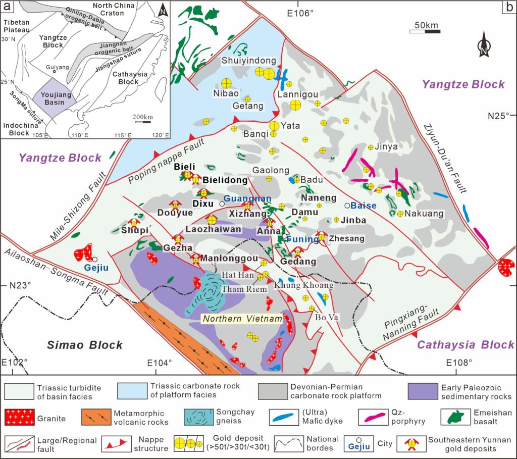 1a右江盆地大地构造位置图;(b)区域地质简图及金矿床分布