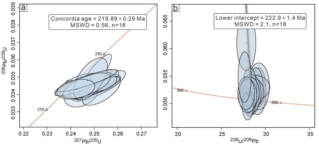 3 底圩金矿热液锆石的谐和图(a)及Tera-Wasserburg U-Pb图解(b
