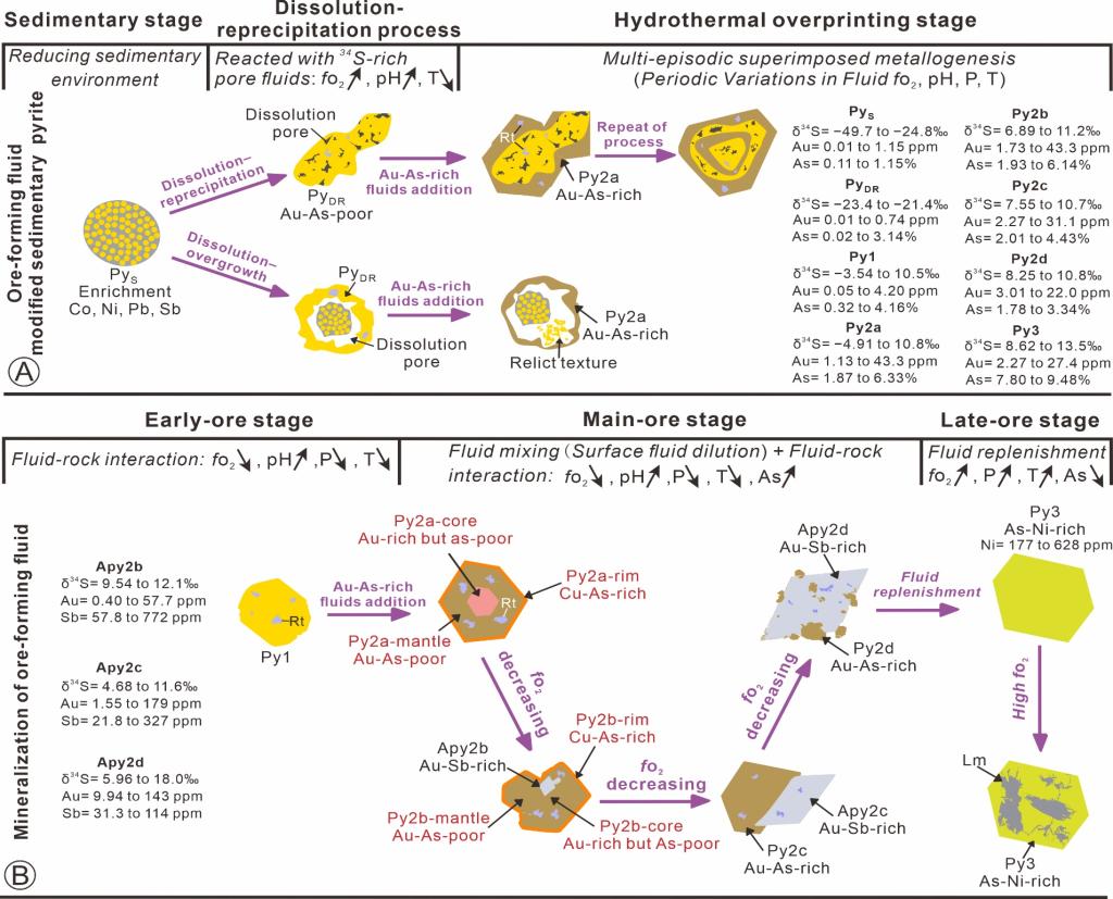 5 不同成矿阶段含矿硫化物矿物结构与成分变化示意图,其形成涉及多期流体活动