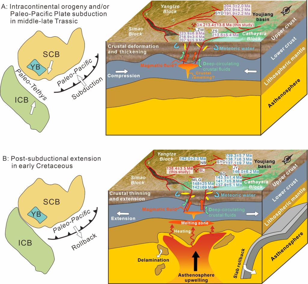 流体包裹体、H-O同位素及热液副矿物微量元素综合研究表明,右江盆地晚三叠与早白垩两期金成矿事件虽均发育岩浆-变质混合成因流体系统且存在大气降水混入,但流体组成比例差异显著,指示二者受控于截然不同的深部动力学过程(4)。晚三叠成矿流体以深循环壳源流体为主,形成于印支造山后期挤压-伸展过渡背景下的强烈水-岩相互作用;早白垩成矿流体以岩浆热液为主导,响应古太平洋板块俯冲后期伸展构造背景下的强烈岩浆活动。上述成果揭示了构造体制从挤压向伸展转换对金成矿流体来源与运移路径的重塑机制。