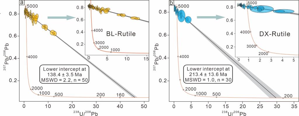通过对与载金黄铁矿和毒砂密切共生的热液成因金红石进行LA-ICP-MS U-Pb同位素定年,研究揭示了滇东南地区普遍存在晚三叠223~213 Ma)和早白垩140~138 Ma)两期金成矿事件2。在此基础上,结合主成矿期热液锆石U-Pb年方法的交叉验证3,系统构建了右江盆地北缘与中南部金矿床统一的两期成矿年代学格架,进一步证实了盆地南北部具有一致的成矿动力学背景。